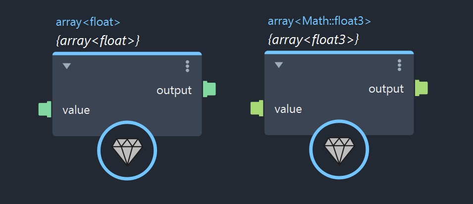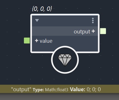 Now that we’ve learned about primitive data types, we can jump into the next subject and start talking about “Data Structures“. These are data types that are composed of multiple primitive data types. The most commonly used data structure is float3 (usually used as a vector or a color). It is simply composed of 3 float primitives. If you take a value node and set the type to Math::float3, and clickon the + icon, you can clearly see the 3 structure members are floats.