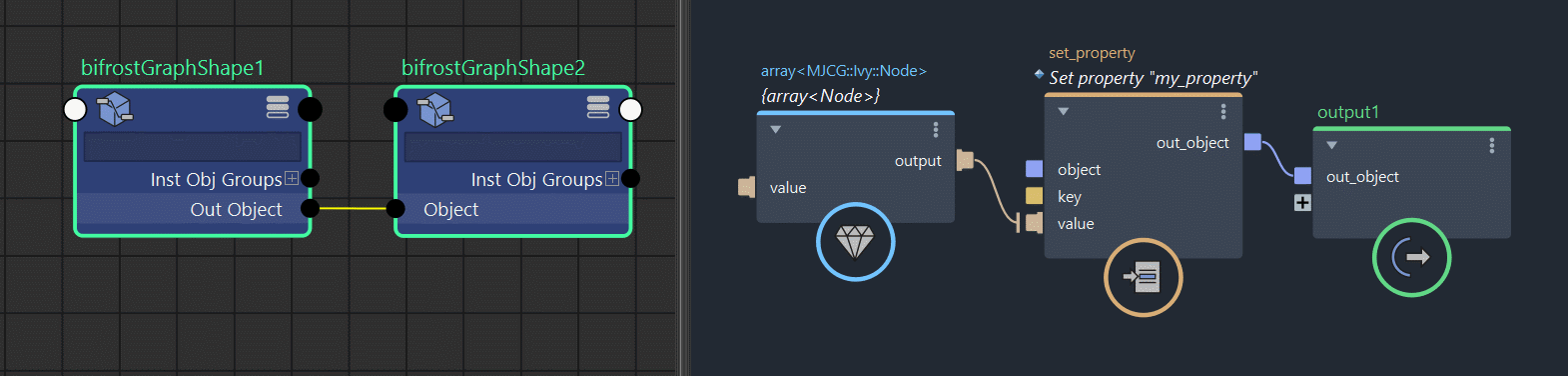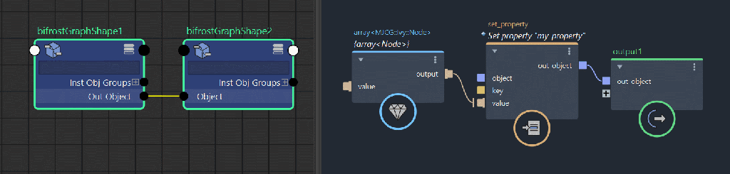 Finally, Bifrost will not allow you to expose these data types on the graph’s top level input / output port. This is because these data types doesn’t correspond to anything in the DCC. You can still transfer these advanced data structures between different graphs though. You just have to store them inside Amino objects using set_property nodes, and get them in the second graph using get_property nodes.
