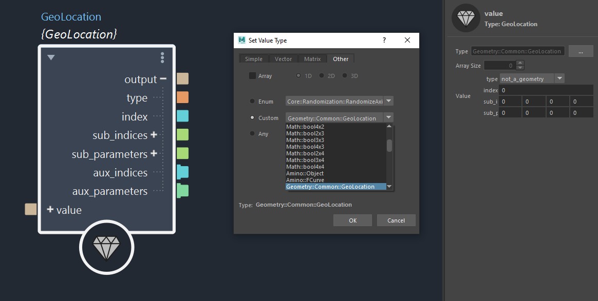 Most of the standard data structures in Bifrost are under the Math:: namespace, but there are also other data structures which can be found in the Other tab of the Set Value Type dialog. A good example of a built-in, advanced data structure is the GeoLocation. As you can see, a single geoLocation value stores other data structures like Math::float4 and Math::uint4, it is also storing array data types like array<float> and array<uint>, and it even holds an enum!