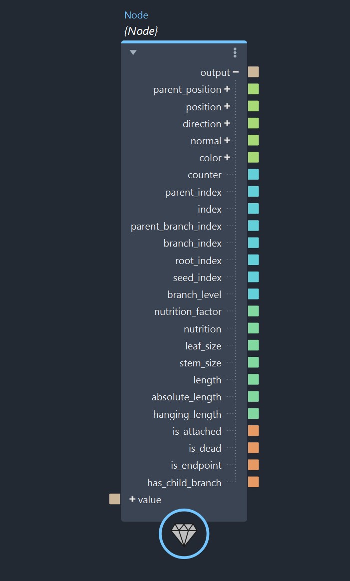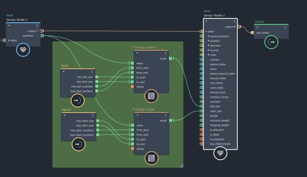 If you look carefully, you can see that there is a connection between output and value of the two value nodes. It is important to preserve this connection as this will allow us to preserve all the data structure’s members. Then, you can see that only the leaf_size and stem_size are plugged into the 2nd value node. By using the structure like this, we don’t have to connect every single members between the two value nodes. Only the members that have input connections get overwritten, while all other members of the structure remains untouched.