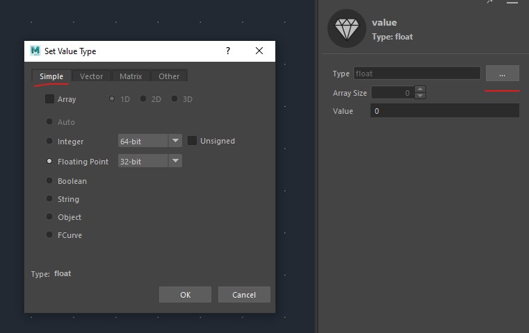In Bifrost, these types are all listed in Simple tab of the Set Value Type dialog which is accessible by using a value node, and clicking the dots on the Parameters Editor, It is also available when right clicking on an auto-port of referenced nodes, and also any port of editable compounds.